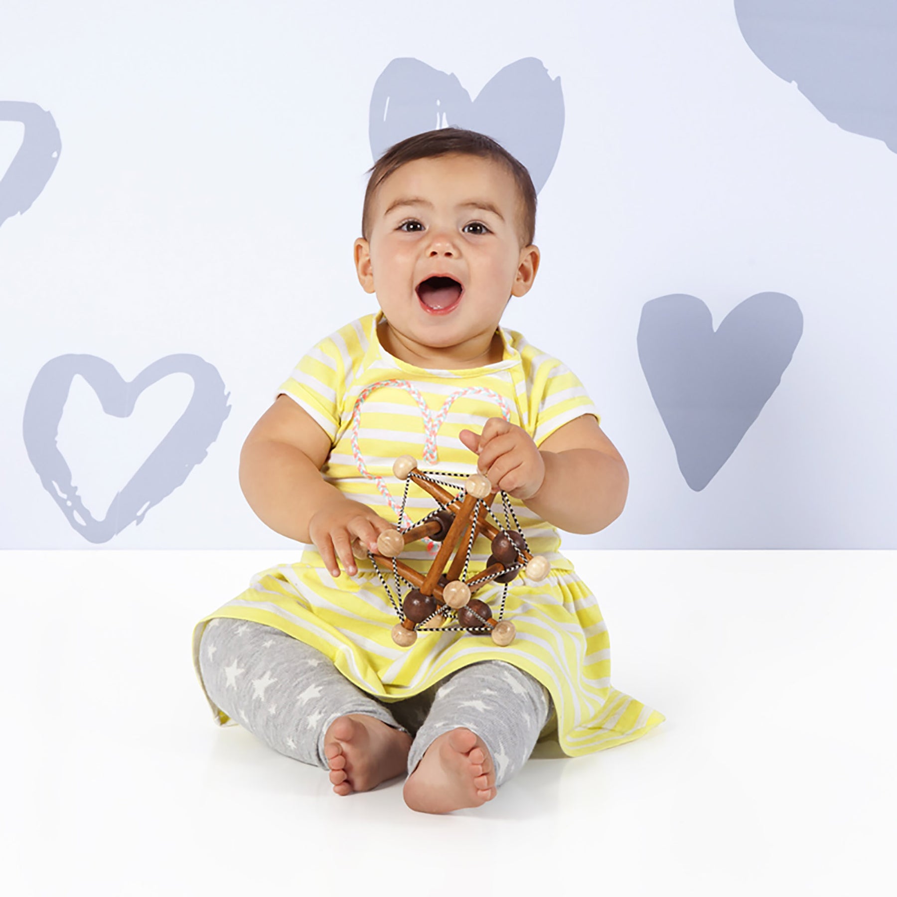 A spin on our classic Skwish, the Artful Skwish takes on a new wood tone while featuring the same springy, rebounding elastic strung between sustainable rubberwood teether rods. It Skwishes and returns to its original shape, with beads that slide and rattle. This multi-sensory activity provides unlimited infant entertainment. It introduces the concept of cause and effect while boosting the development of important gross motor skills such as grasping and reaching. With a striking appearance, Skwish doubles as room decor, perfect for any nursery.