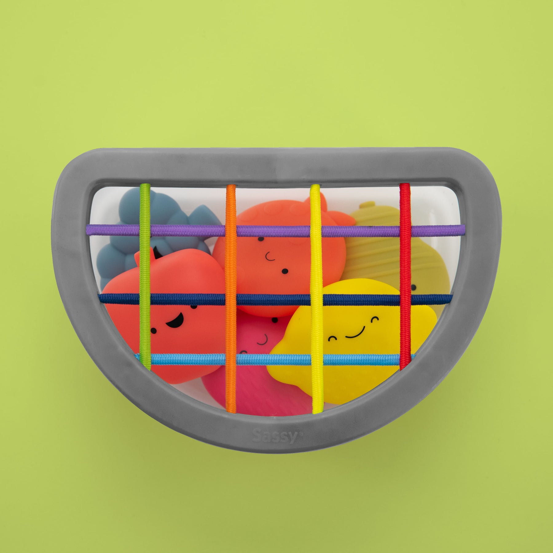 The Sassy Fruit Fill & Spill has textural fruits, learn each fruit’s shape and color, and fill up the container to spill out the contents.