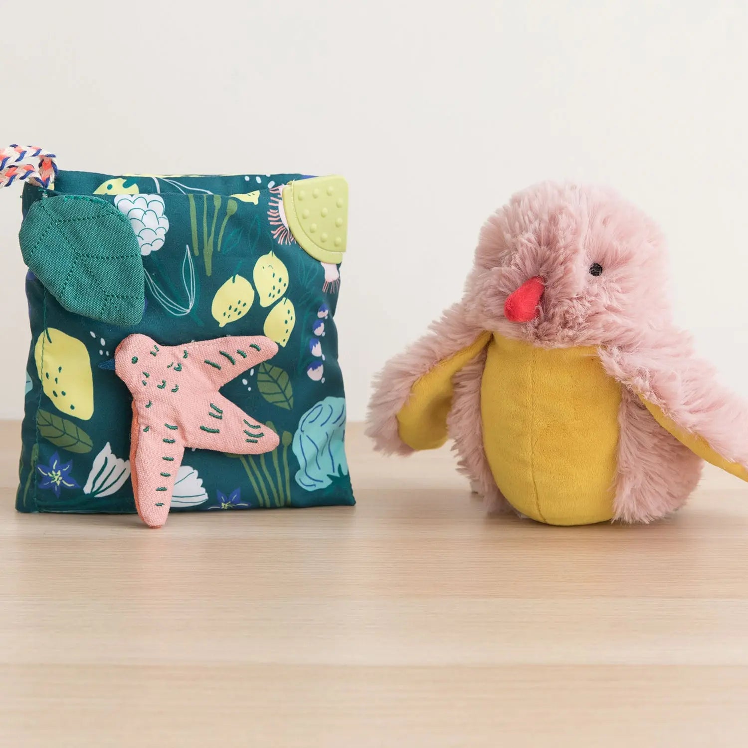 Follow the songbird through different activities on each page. Folding soft book includes tethered-on crinkle bird, colorful illustrations, squeaker, baby-safe mirror, engaging textures and silicone corner teether. Fabric loop allows for easy attachment to baby links. Encourages motor development, cause and effect learning. Safety rated toy for newborns and up. Ideal for when babies are able to reach and grab to experience the full tactile and sensory developmental features. This soft book measures 20 inches by 6.5 inches, and folds up to 6.5 inches square with a fabric closure to keep pages tidy.