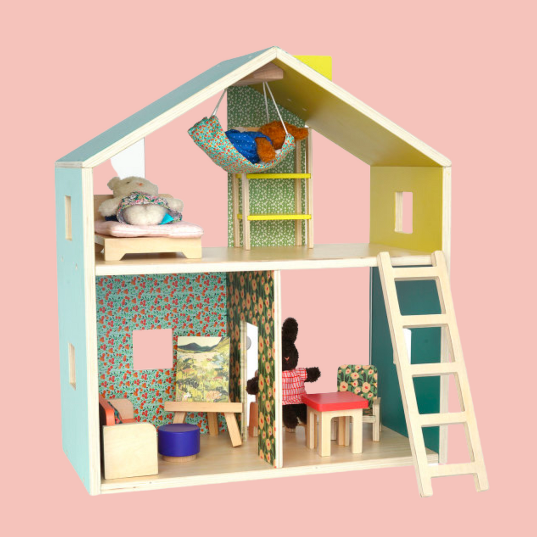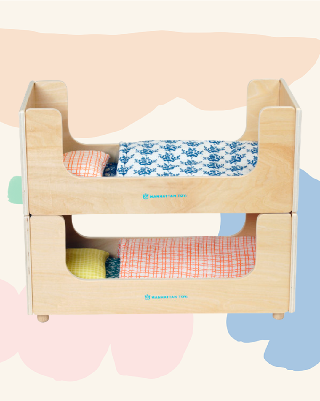 A delightful wood bed with a tufted mattress, pillow, and blanket. Fits dolls and stuffed animals up to 15 inches tall. Stackable for more play options.