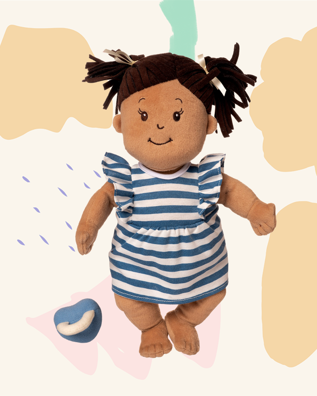 This award-winning doll has brown hair pigtails, a striped outfit, and life-like details. It inspires creative role play with its soft, beautifully crafted features.