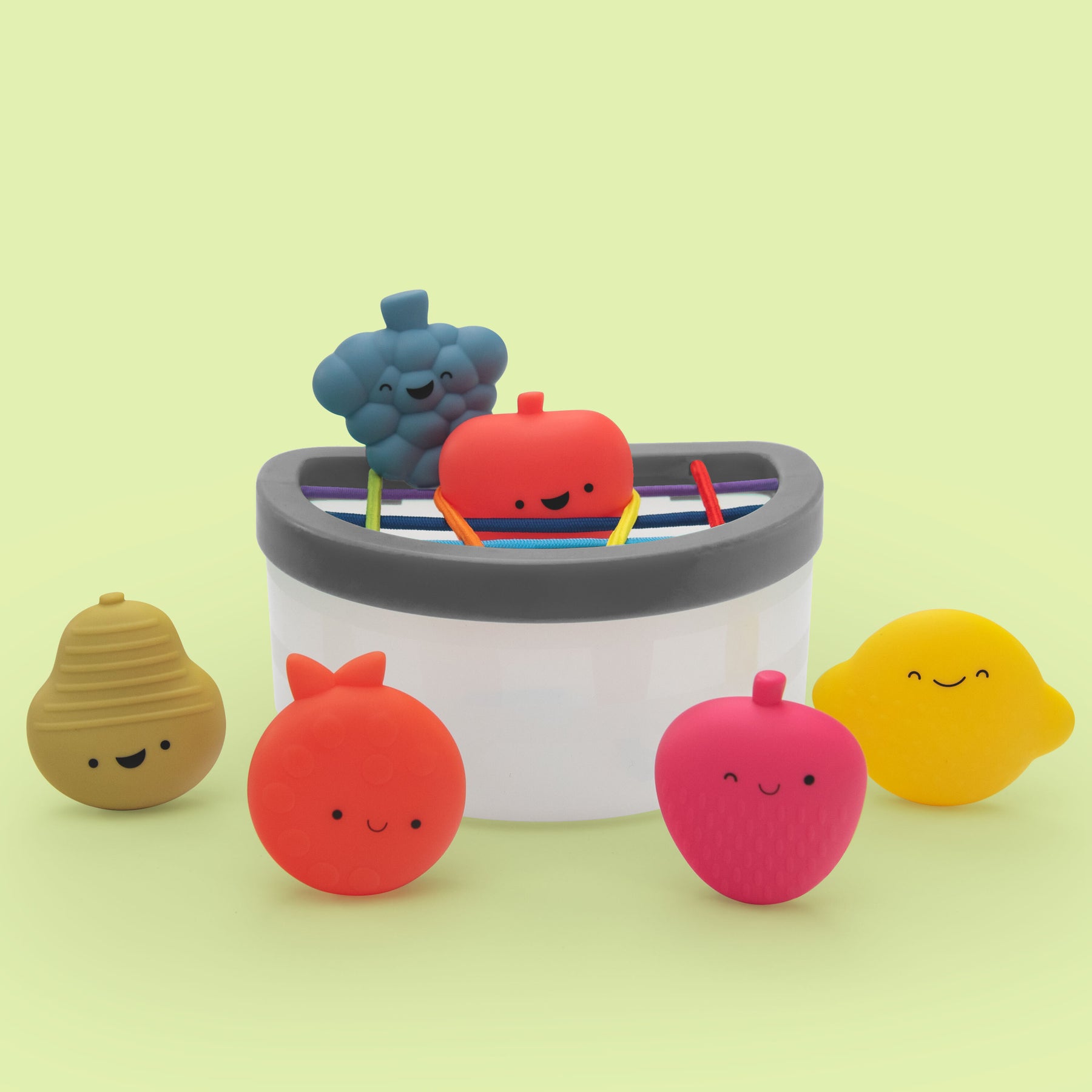 The Sassy Fruit Fill & Spill has textural fruits, learn each fruit’s shape and color, and fill up the container to spill out the contents.