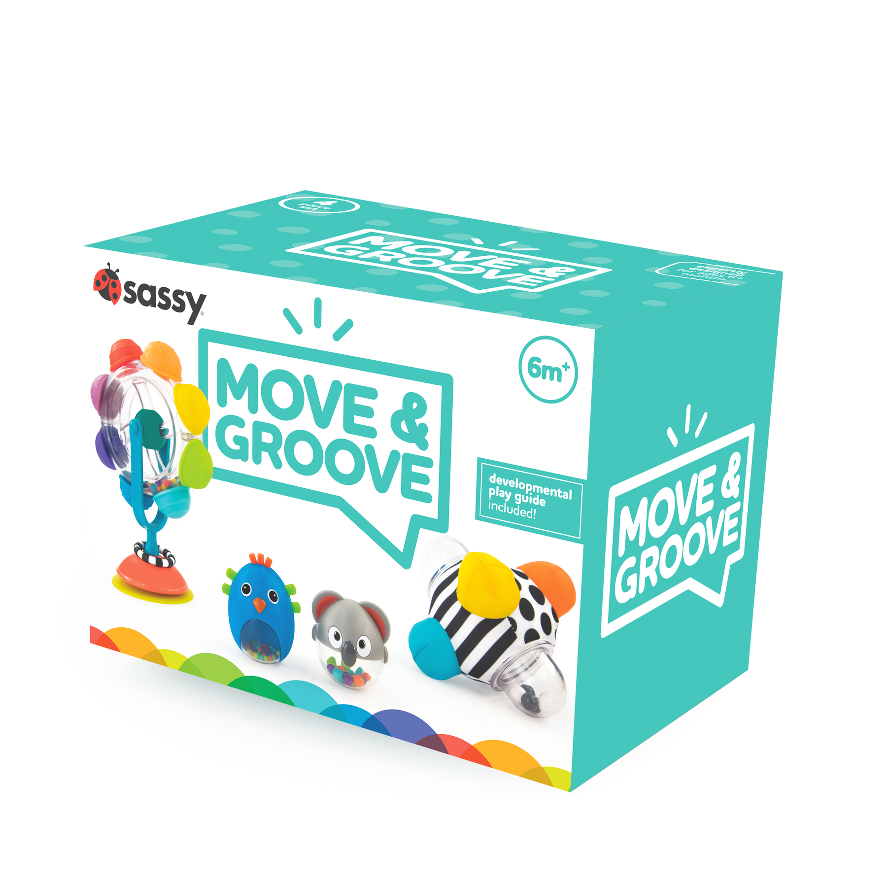 The Move & Groove is a baby box set developed to encourage fine & gross motor skills. Includes a Rainbow Reel, mini shakers, and a Bumpy Ball!