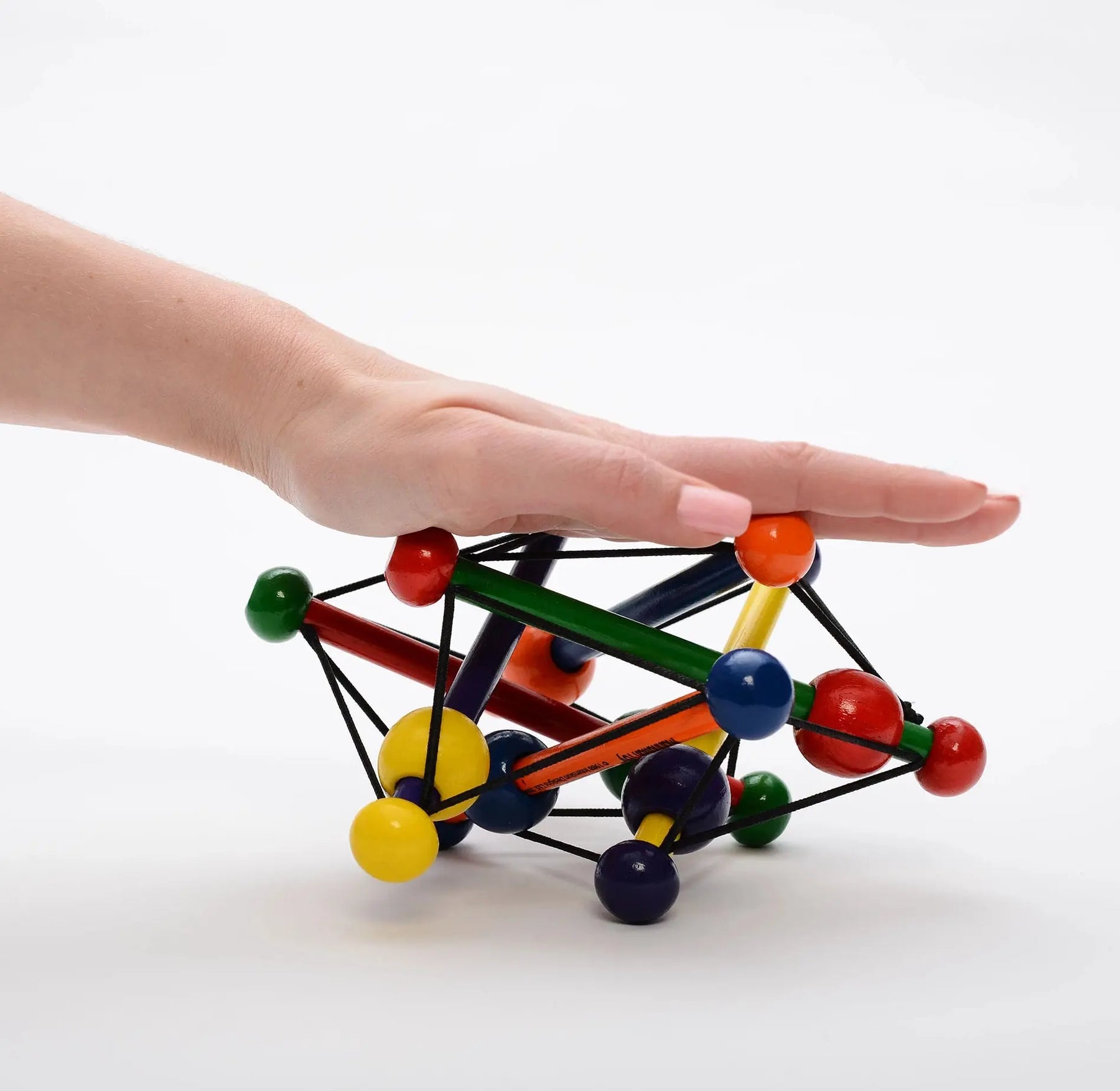 The award-winning Skwish is a one of a kind wood rattle and teether toy with primary colors. Made from renewable rubberwood and strung together with durable elastic cords. It Skwishes and returns to its original shape, with beads that slide and rattle.The unique design offers tactile, sensory play while doubling as a teether and rattle toy. Easy to grasp design encourages fine and gross motor skill development while providing cognitive and visual stimulation. Striking appearance doubles as room decor, perfect for any nursery.