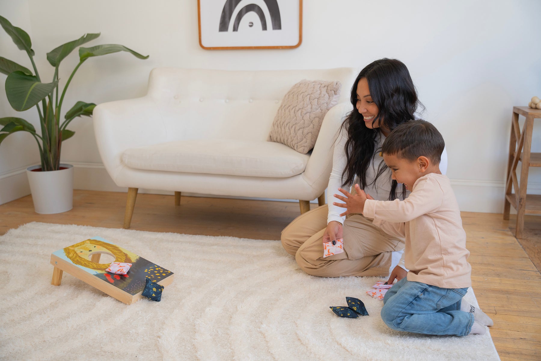 Introducing the Wild Ones Bean Bag Toss Game, a fun and wholesome way to entertain kids aged three and up! Crafted from high-quality wood, this cornhole board set will have your little ones tossing and laughing in no time! So get ready for some wild family fun--no matter the age, everyone's a winner.