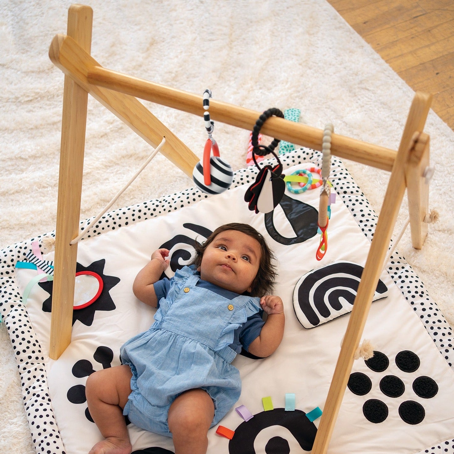 - Bold black, white, and red coloration in support of baby’s developing vision