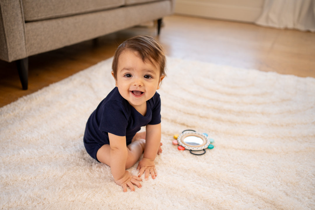 - Face baby away from you while seated on your lap. Face the toy’s mirror towards you. Capture both your reflections and make big smiles, encouraging them to mimic. Every baby starts smiling at different times – that’s ok.