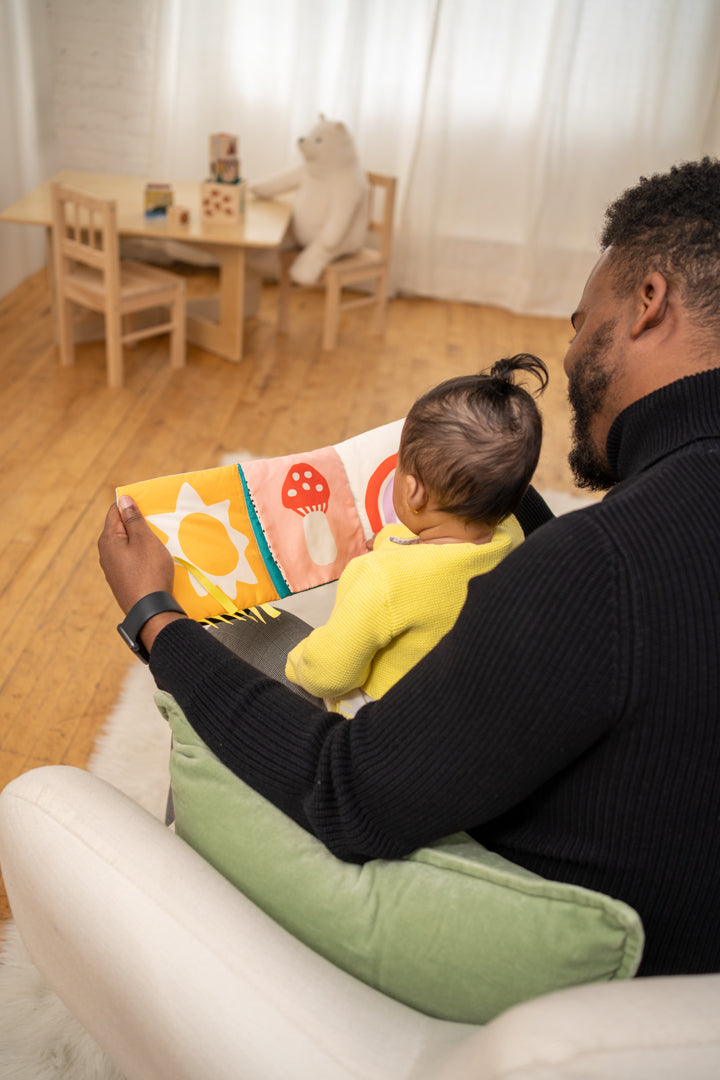 If you’re on the go, lay baby on your legs or seated in their car seat facing you. Holding the book in front of baby’s gaze, point and describe each color and graphic. Mimic baby’s facial expressions to develop a deeper bond while encouraging focusing at different distances.